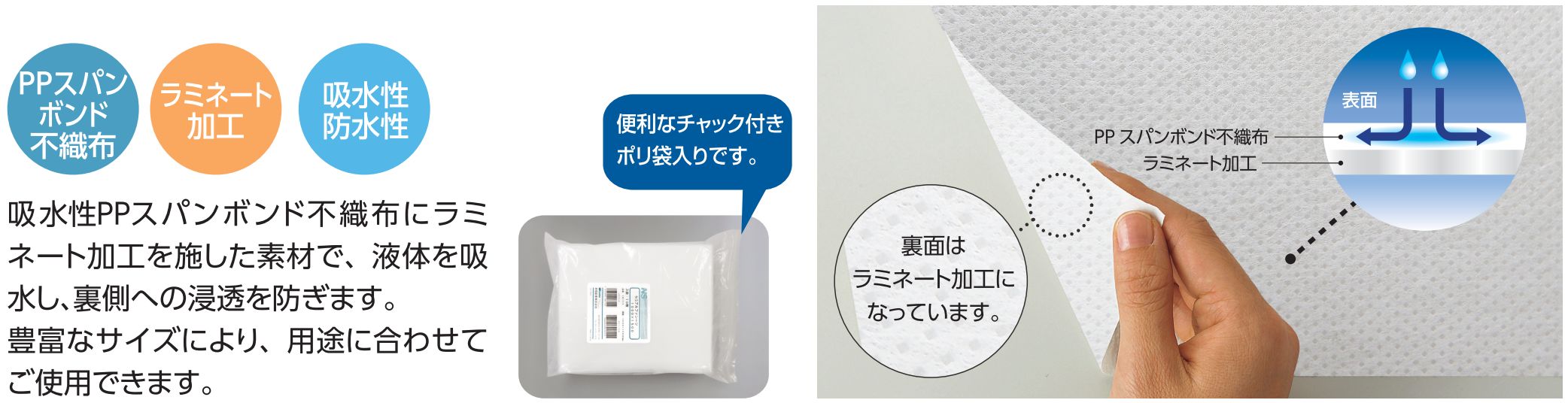 吸水性PPスパンボンド不織布にラミネート加工を施した素材で、液体を吸水し、裏側への浸透を防ぎます。