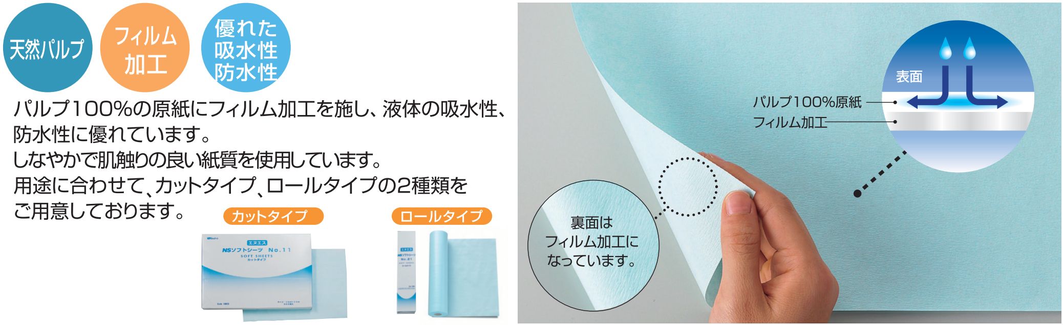 パルプ100%の原紙にフィルム加工を施し、液体の吸水性、防水性に優れています。