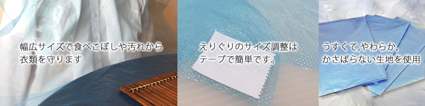 - 幅広サイズで食べこぼしや汚れから衣類を守ります